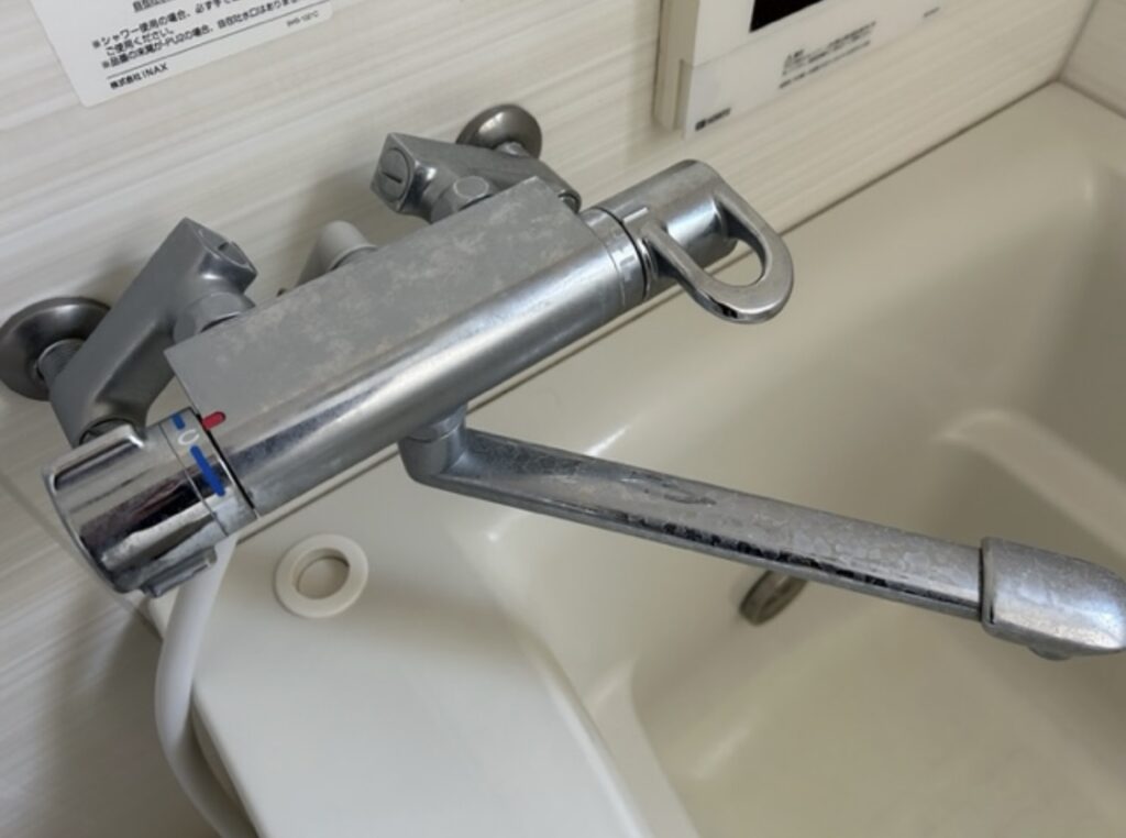水栓まわりの白く濁った水垢汚れ。